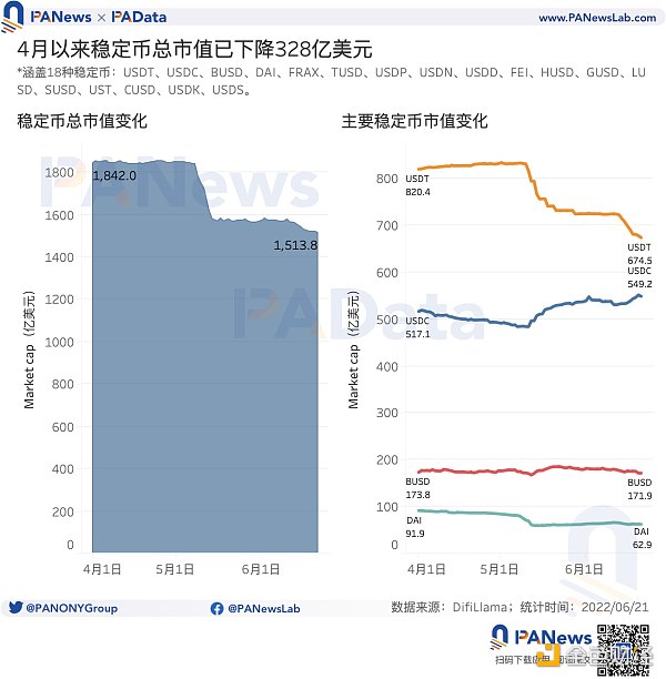 穩定幣由于其交易媒介的功能一直以來都是觀察市場流動性的一個重要窗口,穩定幣增發通常意味著流動性增強,反之亦然。PAData統計了18種市值較大的穩定幣自今年4月以來的市值變化情況,包括USDT、USDC、BUSD、DAI、FRAX、TUSD、USDP、USDN、USDD、FEI、HUSD、GUSD、LUSD、SUSD、UST、CUSD、USDK、USDS。根據統計,18種穩定幣在4月1日時的總市值還有約1842億美元,但5月8日至5月14日期間,總市值斷崖式下跌,從1837.3億美元跌至1578.6億美元,減少了259億美元,跌幅達到14%,相當于這期間每天都下跌2%。此后,6月10日至6月21日,總市值出現了短期內第二次明顯跌幅,從1578.8億美元跌至1513.8億美元,再減少了65億美元,跌幅約為4%。總體而言,4月以來,穩定幣市值已減少了328.2億美元,整體跌幅達到17.82%。