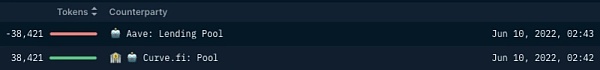 6 月 3 日 15:18,該錢包從 stETH-ETH Curve 池中取出了 47353 stETH 和 3991 ETH 的所有流動性。當時的比率為 0.978 stETH/ETH。不到 20 分鐘,錢包就把所有的錢存入了 Aave,用以補充質押品。6 月 10 日 13:40 至 6 月 13 日 15:54,錢包多次交易 ETH 和 stETH,凈賺 3421 stETH,最終全部存入其 Aave 貸款頭寸。這里似乎沒有任何惡意行為,該錢包只是把它們的流動性從 Curve 中取出來,存入 Aave 作為質押品,很可能是為了防止市場波動期間的清算。