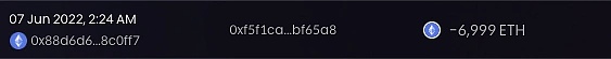 當天 2:20,3AC 變得更加謹慎,因為錢包 B 使用之前存放的 9709 stETH 作為質押,從 Aave 借了 7000 ETH。在 5 分鐘內,這 7000 ETH 被迅速發送到 3AC 的 FTX 存款地址,可能用于出售。該交易可能用于對沖 ETH 價格的下行壓力。
