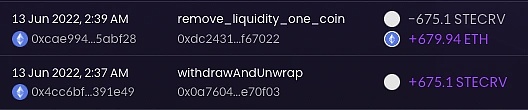 6 月 6 日晚上 9-10 點期間,兩個錢包分別從 stETH-ETH Curve 池中取出所有流動性:54076 stETH/23515 ETH 和 54103 stETH/23489 ETH。兩個錢包仍然持有所有的 stETH,在從 Curve 中移除流動性時,stETH/ETH 比率為 0.978。兩個錢包都很可能希望避免池里的流動性不足,并決定先發制人地清除流動性。