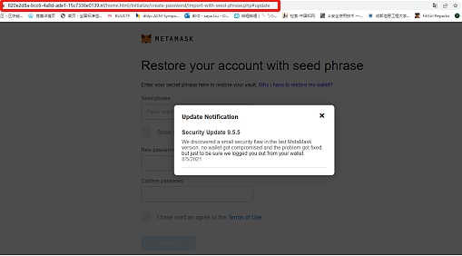 該釣魚網站彈出如下信息,提示用戶檢測到了MetaMask的一個安全問題,需要用戶升級該錢包插件版本。如果用戶在框中輸入助記詞,則會導致錢包被盜。