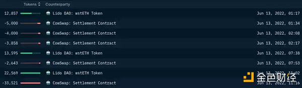 下表顯示了從 6 月 3 日到 6 月 11 日期間進行了大量 stETH 轉賬的前 11 個錢包,按時間順序排列: