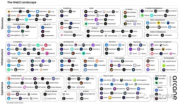 Arcane Research是一家研究機構,建立了自己的 Web3 Database,跟蹤了近500個 Web3 項目。Arcane 并沒有從技術堆棧角度來概括 Web3 全景圖,而是從基礎設施、可體驗 Web3 應用和新應用探索三個層面來展示 Web3 生態全景圖。