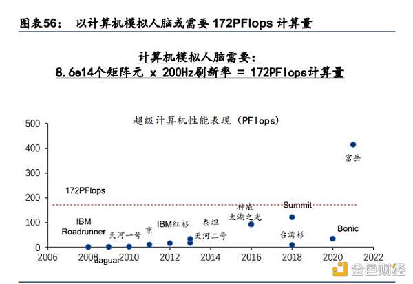 使用電子計算機對人腦進行模擬需要 172PFlops 計算量。人的大腦有接近 860 億個神經元, 每個神經元有 1 萬個連接點,掌管人類運動、聽覺、語言、嗅覺、記憶、思考、性格、情 緒等功能。根據我們估算,如果想要以計算機來模擬人腦的活動需要 172PFlops(對應神 威太湖之光 93PFlops,美國 Summit 超算 122.3PFlops)。人腦的潛能或能夠達到一臺超級 計算機的運算能力。