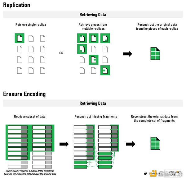 在這些網絡中,有兩種主要的方法用于在網絡上進行存儲數據:存儲完整文件和使用糾刪碼:Arweave 和 Crust Network 存儲完整文件,而 Filecoin、Sia、Storj 和 Swarm 都使用糾刪碼。 在擦除編碼中,數據被分解成固定大小的片段,每個片段都被擴展并用冗余數據編碼。 保存到每個片段中的冗余數據使得只需要片段的一個子集來重建原始文件。