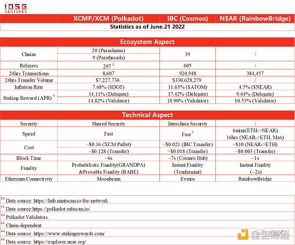 作為小結,在上表中對XCMP/XCM、Cosmos IBC和NEAR RainbowBridge進行了簡要的對比,其中一些數據可能直接涉及到生態間的對比。(RainbowBridge僅僅涉及到NEAR與以太坊的跨鏈,不像前兩者屬于跨鏈生態,但作為輕客戶端的一種,我們同樣放在這里做個對比。)