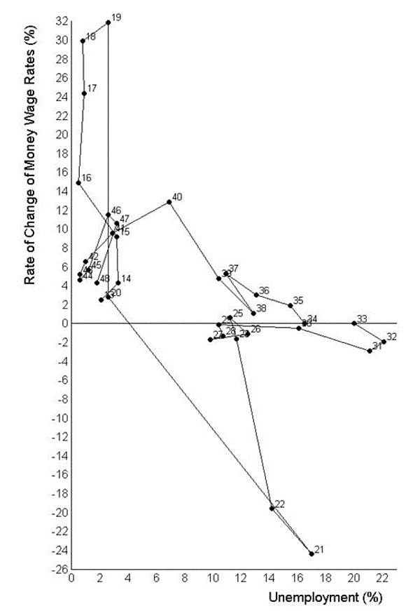 從圖中可以看出,整體而言,通貨膨脹率與失業率存在交替關系:通貨膨脹率高時,失業率低;通貨膨脹率低時,失業率高。