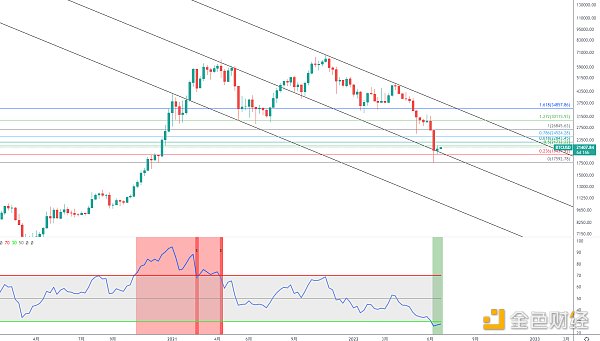 我們看下方BTC月線指數,前期一旦跌至平衡線下方,意味著BTC價格基本已到達各輪熊市底部,例如2011年、2014年和2018年熊市,后面開始長時間底部盤整,然后啟動牛市,目前再次跌至平衡線一帶,說明BTC可能也已探明底部,后面再出現大幅下殺的概率不大,而是進入區間震蕩筑底的概率大,同時下方月線長期支撐線也未破,周線也未破前頂69000下降通道中軌支撐,所以后面還是有望筑底可能,中長線可以考慮逢低布局,短期壓力21750,突破站穩下一壓力22700-23000,短期支撐20400。