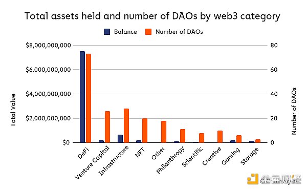 還有大量專注于風險投資、基礎設施和 NFT 的 DAO,這表明 DAO 對投資者、開發人員和藝術家具有吸引力。然而,他們的鏈上國庫相對較小。