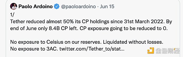 2022Q2 的報告還沒出來,不過根據 Tether 技術長@paoloardoino的講法,他們在 2022/3 之前又贖回了 84 億美金的 CP,2022/5 前 USDT 發行量沒太大改變,合理猜測是轉倉到其他資產去了(大概率是 T-Bill),這意味著 CP 占比又下降到了 13% 左右。