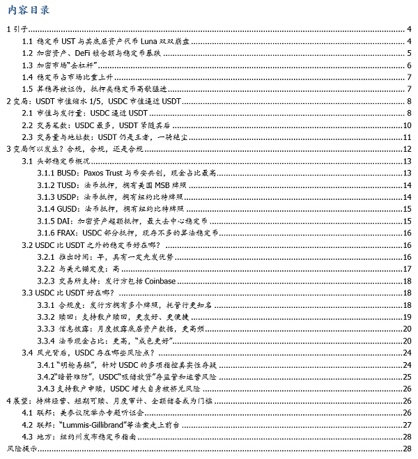 合規度成USDC制勝因素。復盤USDC的上位之路,我們發現,相較于USDT之外的其他穩定幣,USDC的優勢主要是:1)推出時間早,有先發優勢;2)與美元錨定度高;3)交易所支持。相較于USDT,USDC的優點包括:1)發行方擁有紐約比特等多個牌照,托管行包括多家美國知名銀行;2)支持實時贖回,對散戶更友好、更便捷;3)月度披露底層資產數據,較USDT季度披露更高頻;4)法幣現金占比更高,“成色更好”。最新可比時間,USDC現金占比達24%,USDT則約為5%。盡管USDC風光上位,但也遭遇了或虛或實的指控,我們認為,尤其要注意的是,1)Circle通過百慕大分支開展的“吸儲放貸”業務存在監管和運營風險;2)在當前的市場環境中,USDC從中獲取用戶信任的一些要素,也可能會讓自己置身較大的被擠兌風險,例如,支持散戶實時贖回。