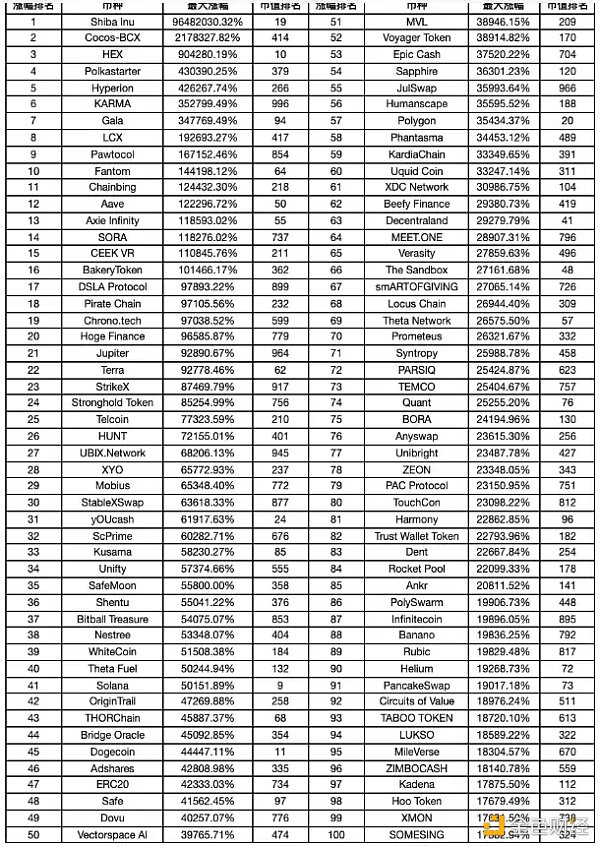 漲幅最高的是 Shiba Inu,漲幅為 96482030.32%(幫你數過數量級了,96 萬倍),當前市值排名第 19。