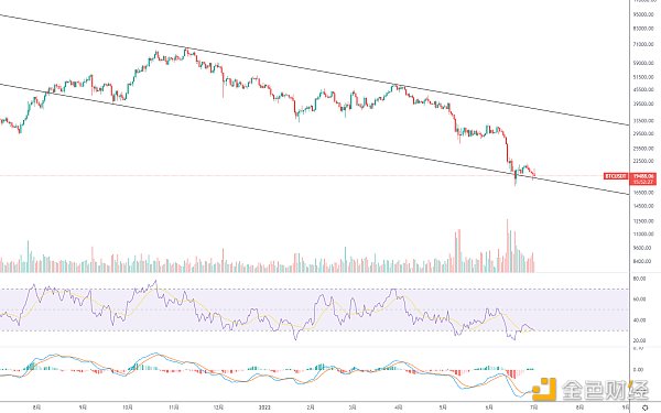 BTC依舊未破下方趨勢線支撐,昨日分析已經提到過,這一帶同時也是頂部1.618回撤線位置,我們看2011、2014和2018年熊底也是回撤至1.618附近見底,后面長時間震蕩筑底,然后發動牛市行情,2019年小牛見頂14000回落至最低3800,也是位于這一輪1.618位置附近,目前走勢較為相似,不過需要注意下方兩線目前還是下滑姿態,后面將會跌至虛線下方,兩線低位金叉還需要時間,我們看之前兩線虛線以下金叉,后面均走出牛市行情,只是醞釀時間長短區別,短期看日線已觸碰到軌道支撐線,和前期放量下砸相比,空頭量能相對萎縮,指標線上行,所以有望形成雙底或者底背離的機會,下方趨勢線不破,激進者可以考慮逢低布局,穩健者可以等待右側金叉機會。