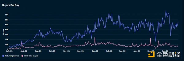對 NFT 購買者趨勢的仔細分析顯示,在 6 月份,我們看到首次購買者和復購用戶再次緩慢進入市場(見圖 12)。鑒于之前的相關性分析暗示 NFT 與主流加密資產之間的相關性低于普通代幣之間的相關性,這一發現促使我們探索 NFT 特定的統計數據,并評估它們是否以及如何早于 NFT 價格發展。