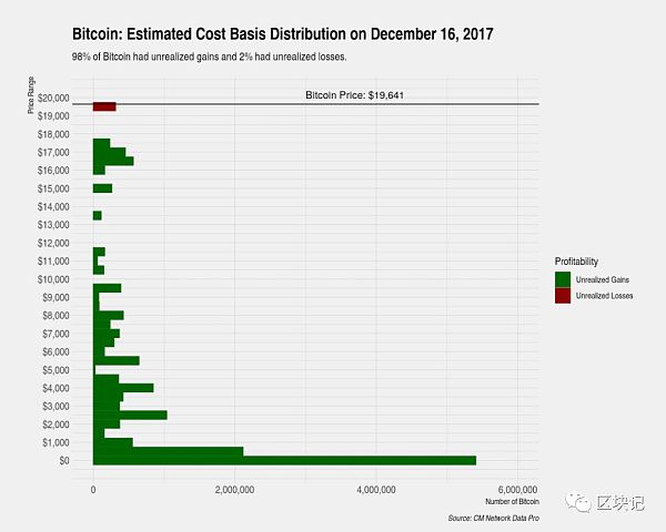 在一年的時間里,價格超過了之前的歷史高點1100美元,并在2017年12月16日達到了接近20,000美元的高點。下圖顯示了這一日期實際成本估算的分布情況。這時挖出的比特幣共有1675萬個,大約有740萬個在早期參與者的手中,實際成本估計在0至1000美元之間,這些比特幣中有98%都有賬面收益。