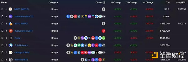 而由 Defi Llama 跨鏈橋鎖倉量統計顯示,目前排名前八的跨鏈橋 TVL 之和約 100 億美元,占 DeFi 總鎖倉額的 50%。