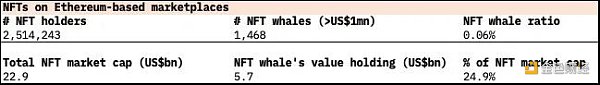 目前鯨魚中心化導致的NFT金融市場波動也加劇了流動性問題。在大多數基于以太坊的NFT市場中,0.06%的鯨魚(擁有100萬美元以上的NFT持有價值)持有價值57億美元的NFT,在截至2022年7月6日222億美元的全球NFT市值中占25.7%。