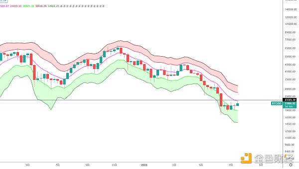 如圖所示,BTC最高反彈到23000附近便遇阻回落,已經處于圖中紅色軌道壓制區23000-24000,前期自軌道由綠轉紅,BTC便一路下滑到后期加速,期間幾次反彈均被軌道壓制,后面重新站上才有望迎來趨勢反轉,并且這一帶也是前期日線下跌中繼頂部區,同時也是下方周線下滑中軌線和前期大陰1/2位,所以壓力還是比較重的,一次性過不去一般就會回調整理,蓄勢后再次向上沖擊,多次試探后面突破的概率就大了,我們從下圖可以看出BTC已進入紅色區域,前期轉紅是在2014和2018熊市底部,震蕩筑底后向上發力重新站上,啟動后面牛市,包括2020年3月大瀑布,BTC從軌道下方低位重新站上,展開本輪大牛市,所以本次也是有望走出筑底行情,短線在未有效突破前,依舊可以考慮逢高減倉。