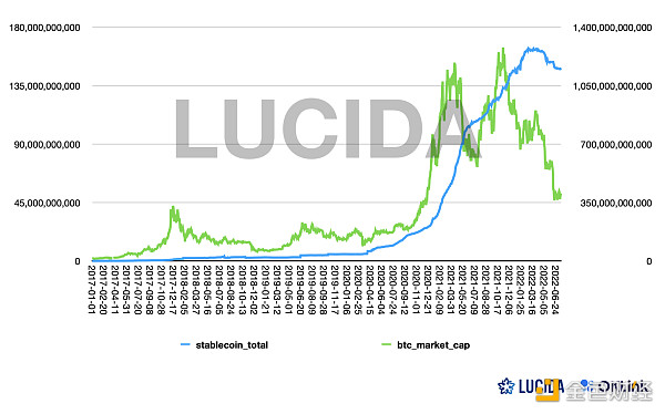僅觀察穩定幣整體的發行情況是不夠的,因為曲線趨勢還是整體向上的,無法用來預測市場。LUCIDA 自擬了一個「穩定幣增發速率因子」,來預測市場。