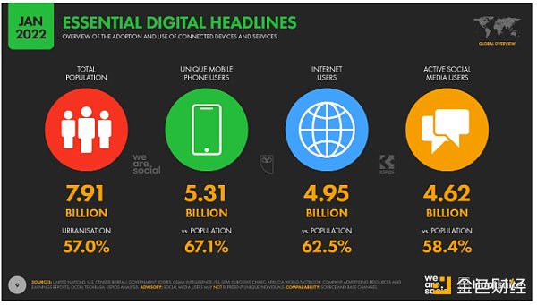 互聯網的發展我們大致可以想象成一個人類的精神需求逐漸影響生活需求的過程,起初不管是網購、視頻還是游戲,都只是人們生活中的一小部分,這個階段人們的共識是“網絡都是虛擬的”,大多數人還是用著紙鈔、公用電話、習慣每逢周末去逛逛地下商場。但是進入 Web2.0 的尾聲,互聯網已經輻射到人們的大部分生活,輻射到什么程度呢?我們引用來自《Digital 2022 Global Overview Report》的數據: