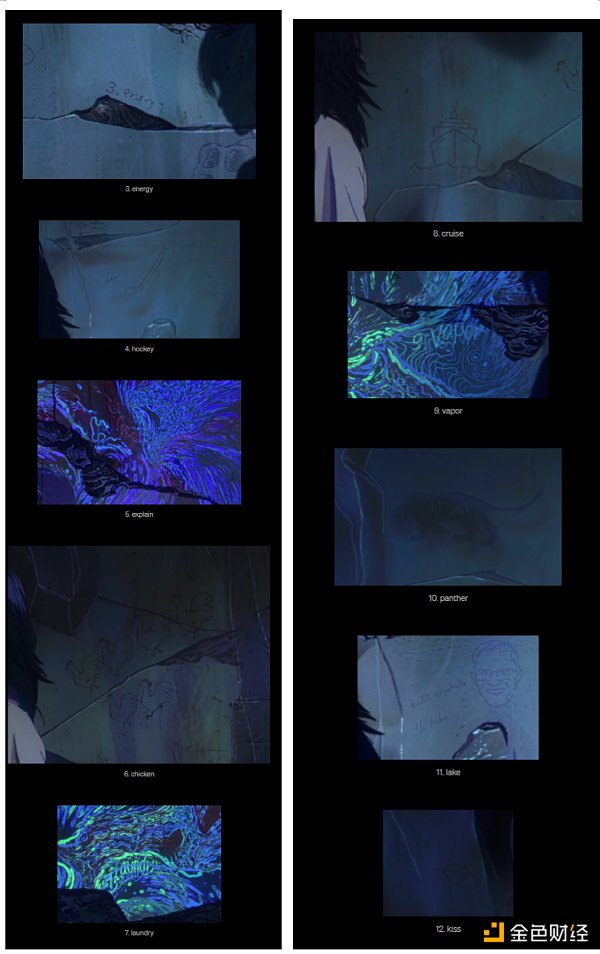 作為新的嘗試,除了代幣激勵、共同擁有一部作品的預期,Shibuya用什么方法加強社區的參與度呢?尋寶彩蛋環節算是其中之一。第一章的彩蛋是把藏有4個NFT(均由shibuya團隊成員創作)的一個地址的助記詞,以文字、圖畫形式分布散落在影片的不同部分,讓觀眾去收集;第二章就直接一點,選擇中間空投的禮物,即可得到空投的NFT「Something Cooking」,這個NFT用途尚未明確,會不會在后續環節里能用得上?