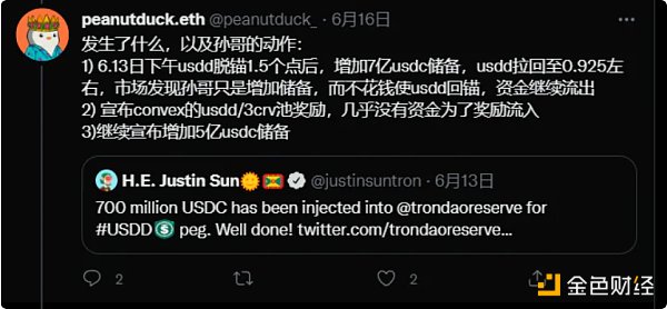 而我更傾向于是后者。當USDD沒有回鉤時,市場的反應大多是重現UST脫鉤的幻覺。而技高一籌的孫哥甚至直接推特明牌:“莫慌穩住,正在部署更多資金。”