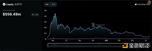 18、我們來看看Liquity的TVL(一個借貸協議dapp)。USD借入量從之前的幾乎50億美元到現在只有5.56億美元(歷史最低值)。借貸和杠杠是極其重要的(當得到正確使用時),因為它們是支持鏈上活動、刺激購買不可或缺的因素。