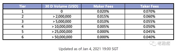 如下圖所示,該交易所還根據用戶30天的交易量收取不同水平的交易費用: