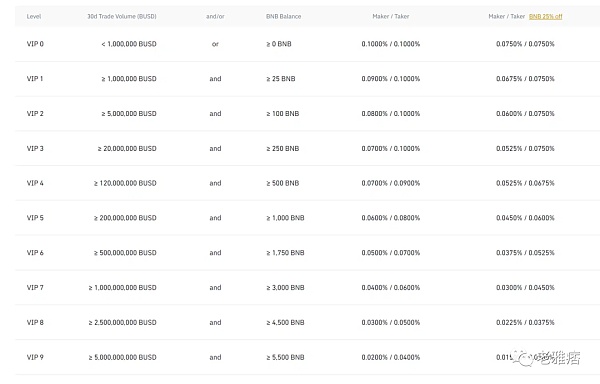 幣安的賬戶分為10個級別。用戶可以通過兩種方式升級VIP級別,一種是通過保證金賬戶或現貨賬戶實現設定的交易量,另一種是購買并持有一定數量的BNB token。此外,如果交易者使用BNB作為交易的基礎貨幣,那么他們將獲得額外25%的交易費用折扣。下表顯示了maker-taker費用如何隨著賬戶等級的上升而變化。