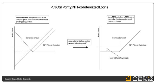 貸款相當于看跌期權(如果 NFT 價格跌到低于借款金額,那么用戶最好違約),通過擁有 NFT(在合約中)并擁有看跌期權,用戶創造了看漲期權的回報情況,避免了超過規定價格的損失。