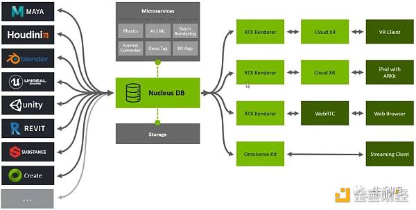 Omniverse支持3D資產的協作流程,其引擎是Nucleus數據庫,它允許多種應用存儲、共享和修改元宇宙相關數據,而USD就是他們之間的通用語言。多個用戶可以連接到Nucleus,以 USD 代碼段的形式傳輸和接收對自己場景的更改。可以這樣說,Omniverse將USD的理念又向前推進了一大步。