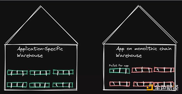 特定于應用程序的區塊鏈實現了我們所謂的區塊空間“倉儲”。如果你把區塊鏈堆棧看作是一個供應鏈,那么堆棧各個部分的區塊空間在技術上是由其所在的鏈/層上的應用程序“購買”的。這意味著,它與無數不同的應用程序一起為居住在同一區塊空間的氣體支付費用,這導致它高度擁擠和競爭,因此推動了費用上漲。