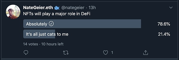 上周六 (5月2日),Mintbase 的創始人 Nate Geier 發起一輪投票,標題:NFTs will play a major role in DeFi,投票選項: