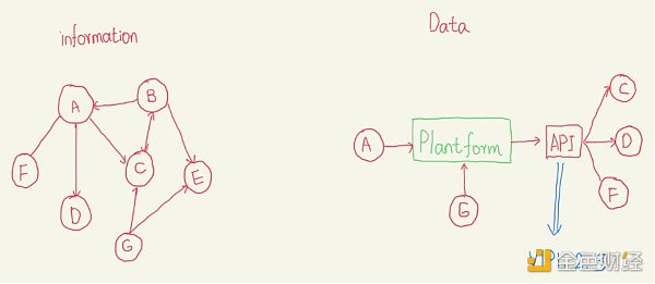 第一點,在現有的社交網絡中,存在著信息流和數據流的反方向流動的現象,用戶之間的信息流是雙向流動的,我 follow 你,你回關我,我們可以看見對方的信息內容,但是這些內容背后的數據并未與信息流同步,而是被存儲在中心化平臺之上,比如 twitter 和微博;