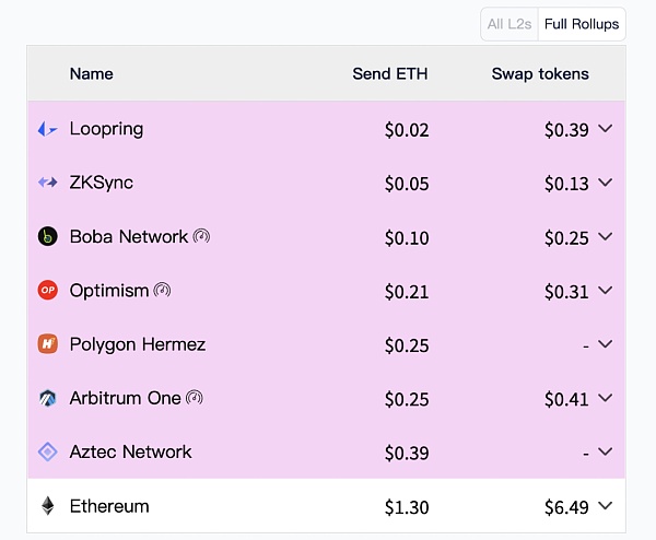 對比ZK Rollups,即使是最便宜的Loopring、最簡單的一筆ETH轉賬也要花費0.02美元。采用Validium模式為IMX的手續費節約了至少10倍。