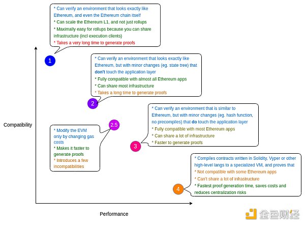 類型1:ZK-EVM是我們最終需要的,使以太網第1層本身更具可擴展性。從長遠來看,在類型2或類型3 ZK-EVM中測試出的對以太的修改可能會被引入到以太本身,但這樣的重新設計伴隨著它自己的復雜性。