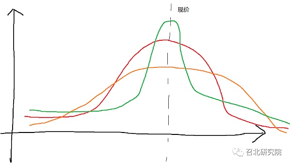 當然,概率到底是個啥樣,是個真正的玄學,可能更尖峰肥尾,也可能是歪的,但是一般來說,現價附近的概率是最高的,中間肯定鼓個大包: