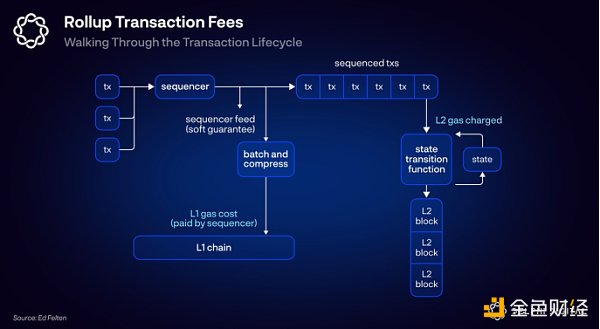 用戶在應用狀態轉換并執行其交易時被收取 L2 gas。L1 gas 是在之后處理批量交易時支付的。L1 和 L2 gas 價格根據各自的擁堵情況而不同。因此,用戶在兩種 gas 中產生費用,而且有時間錯配。定序器在知道批量交易的全部內容、壓縮程度或發布時 L1 的基本費用是多少之前,就承諾進行交易并收取 L2 費用。