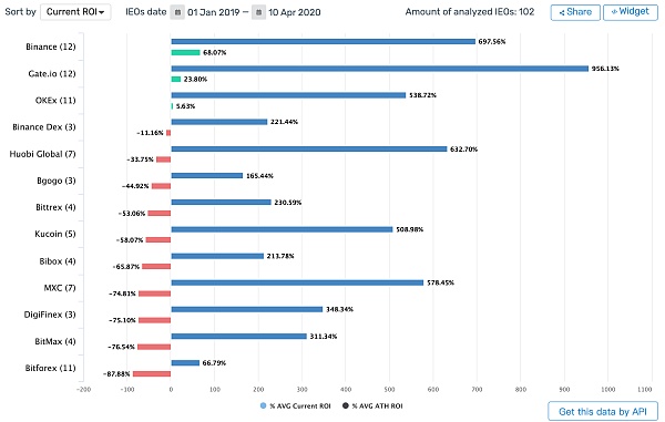 從收益率方面看,截止到2019年12月,僅Gate.io和幣安的IEO項目尚有20%左右的收益;截止到2020年4月,幣安、Gate.io、OKEx的IEO項目尚有營收,其他交易所的均跌破發行價。
