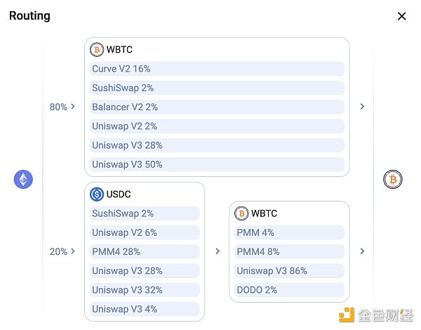 現在1inch集成的Synthetix原子交換也僅限于直接買入或賣出Synth的交易。如下圖所示,若將1000 WBTC兌換成sUSD,其中40%的WBTC會先由Curve和Saddle兌換成sBTC,再通過原子交換兌換為sUSD,顯示為“Synthetix Atomic”。