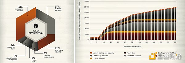 在通證的分發方面,用于社區獎勵占據了33%的最大比例,而關于具體的獎勵方法則涉及到游戲的經濟模型,我們會在后文描述。