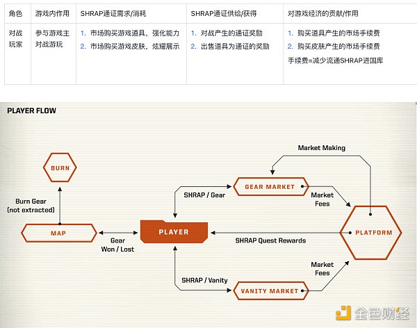 當我們再細化一步,考察通證在游戲內的具體供需,則存在4類不同的游戲內參與角色,他們的行為共同構成了基于SHRAP通證的游戲經濟: