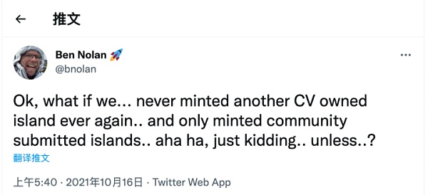 作為一款 Web 3.0 應用,CryptoVoxels 也在考慮在未來朝向更加去中心化的方向發展。Ben Nolan 曾在個人社交媒體分享了他的想法,在未來,也許 CryptoVoxels 官方不會再發售任何土地,只會在用戶提交需求時為用戶單獨鑄造出一塊土地。