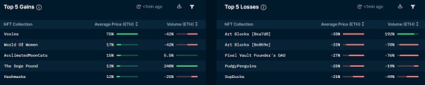 使用上述儀表板,用戶可以從交易量和市值的角度分析該指數隨時間的變化,包括過去 3 個月和日內統計數據。自今年年初以來,圖表顯示以太坊上的 NFT 活動大幅增加。同樣,與前 24 小時相比,用戶還可以識別過去 24 小時內最大的贏家和輸家。