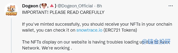 Dogeon最近公布了合作伙伴,白皮書和網站,小編留意到它的首批鑄造由于雪崩鏈交易延遲,鑄造的首批小狗可能不能在頁面LOAD出來,但在區塊鏈瀏覽器可以查看到到資產。