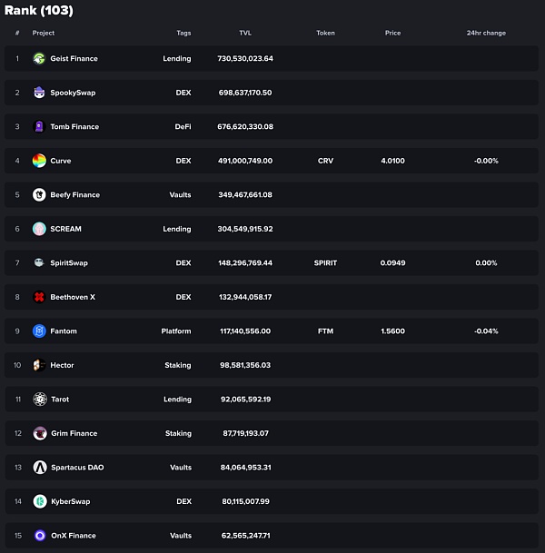Fantom生態中排名前十五的dapps如下圖所示,其中借貸應用Geist Finance以7.3億美元的總鎖倉量排在第一位,去中心化交易所SpookySwap以6.98億美元的鎖倉量排在第二。