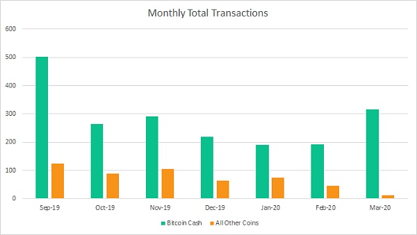 舉個例子來說:在市場環境更加開放的澳大利亞,BCH的商戶采納和個人消費就在零售支付中遙遙領先。(下面我擺上兩個澳大利亞零售業的加密貨幣使用對比圖)無論是從整體消費金額,還是消費次數,BCH的表現都是遙遙領先的。