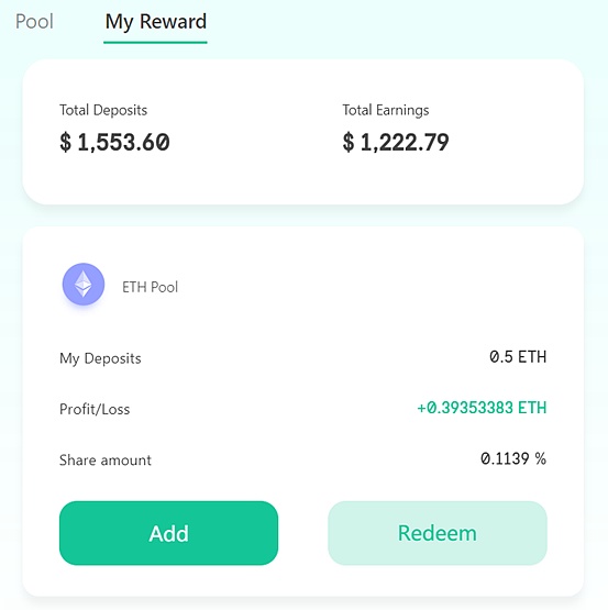 其中,我們可以存入這四種代幣以獲取相應收益。并且,并且,存入LP的用戶也可以通過“My Reward”一欄看到投入的金額和收益。例如,投入0.5 ETH LP后的收益: