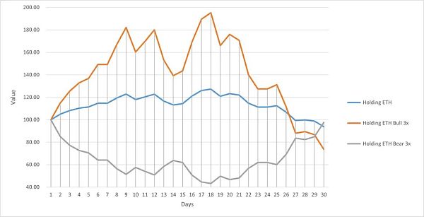 假設 3 位用戶在第 1 天分別對 ETH、ETH Bull 3x 和 ETH Bear 3x 進行了 100 美元的投資。ETH 價格在接下來的 30 天內變化如下。