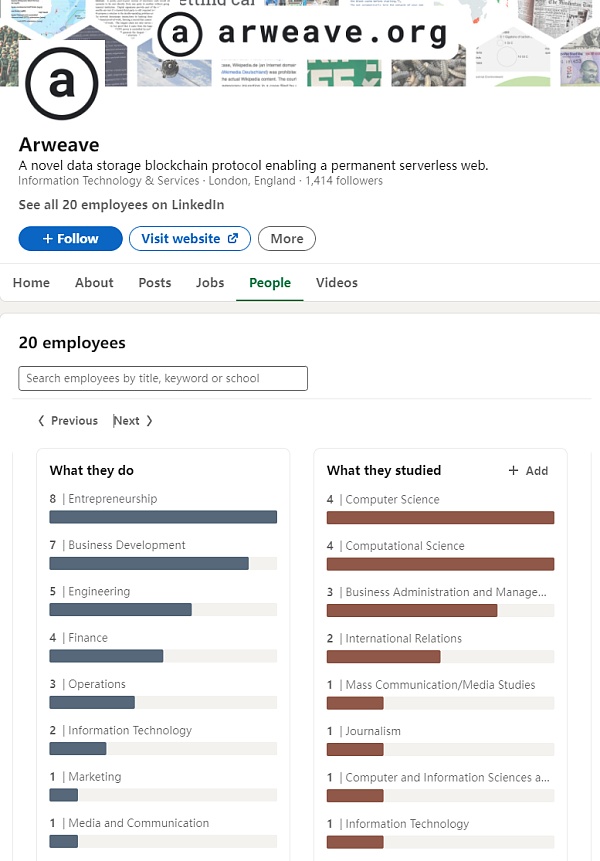 根據Arweave的Linkedin顯示,該團隊目前有20人,在業內屬于非常精簡的團隊規模。大部分團隊成員位于歐洲柏林,崗位中BD占比最高,其次是工程師。